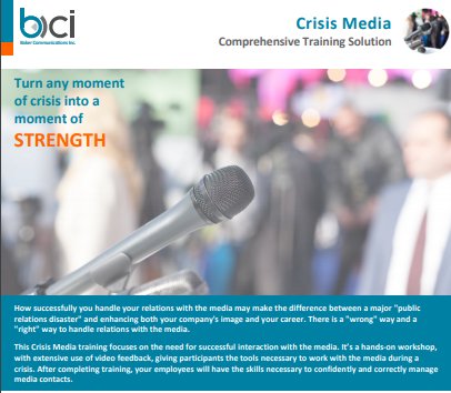 This Crisis Media Training workshop focuses on the need for successful interaction with the media. It’s a hands-on workshop, with extensive use of videotape feedback, giving participants the tools necessary to work with the media during a crisis. After completing training, your employees will have the skills necessary to confidently and correctly manage media contacts. Includes 6 e-learning videos.